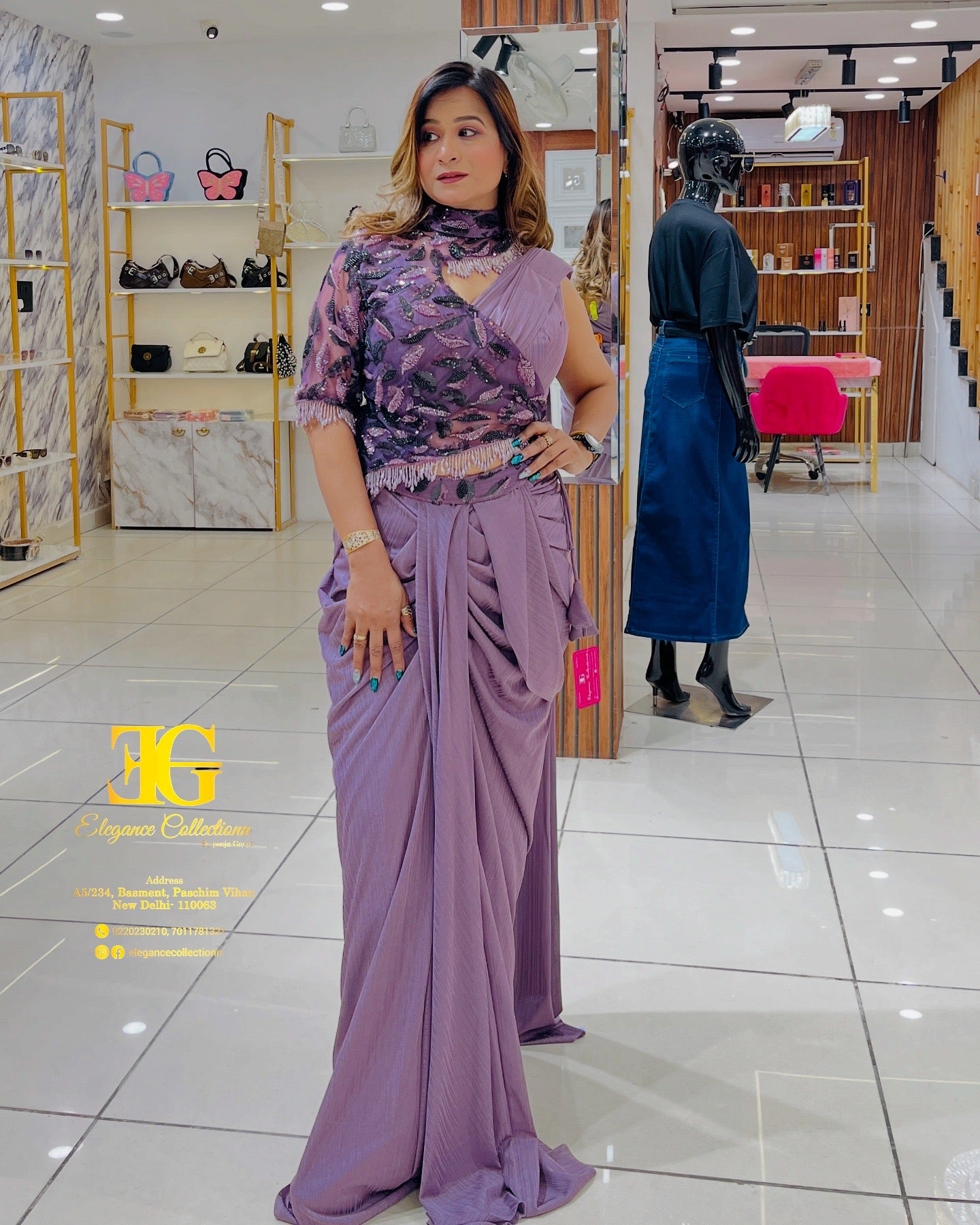 pre-stitched drape saree, where tradition meets modern elegance. Crafted in a luxuriously soft pleated fabric, this ready-to-wear ensemble combines the grace of a saree with the ease of a gown.